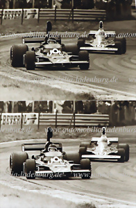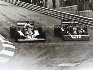 Original b/w photo Clay Regazzoni on Ferrari 312T2 in a duel with Patrick Depailler on Tyrrell P34, GP Monaco 1976, 18x24cm, stamped "Alois H. Rottensteiner"