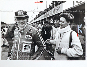 Original b/w photo Niki Lauda with his wife Marlene Knaus in the pit lane 1977, (Lauda on Ferrari 312T2), 16,5x21,5cm