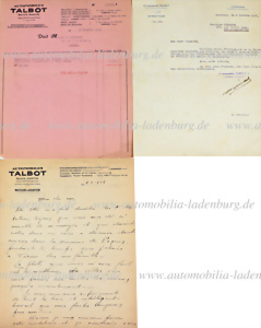 Bundle of 3 pieces, correspondence between Automobile Talbot and Chinetti, including handwritten letter dated 02.05.1929; letter concerning the return of an electric injection pump, dated 08.10.1937, signed by G.Bernad, as well as commission statement to Mr. Chinetti, granted by Mr. Lago for bodywork on the former car of Rene le Bégue, in the amount of 5000 Francs, dated 31.10.1937