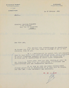 1936, letter from the company Automobiles Talbot to Mr. Maurice Philippe of the magazine "Le Journal", here Antonio Lago describes that he has carefully examined the description of the patent, but from a practical point of view the invention would cause him some difficulties in the implementation. In his opinion, it is theoretically very well thought out, but not suitable to arouse the interest of designers for immediate implementation, dated 27.02.1936, signed by Antonio Lago