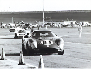Original b/w photo Hawkins / Stewart on Ferrari 330P4, Brands Hatch 1967, 13x18cm, stamped "Attualfoto"