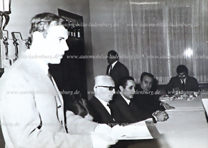 Original b/w photograph of Enzo Ferrari at a press conference, 13x18cm, stamped "Attualfoto"